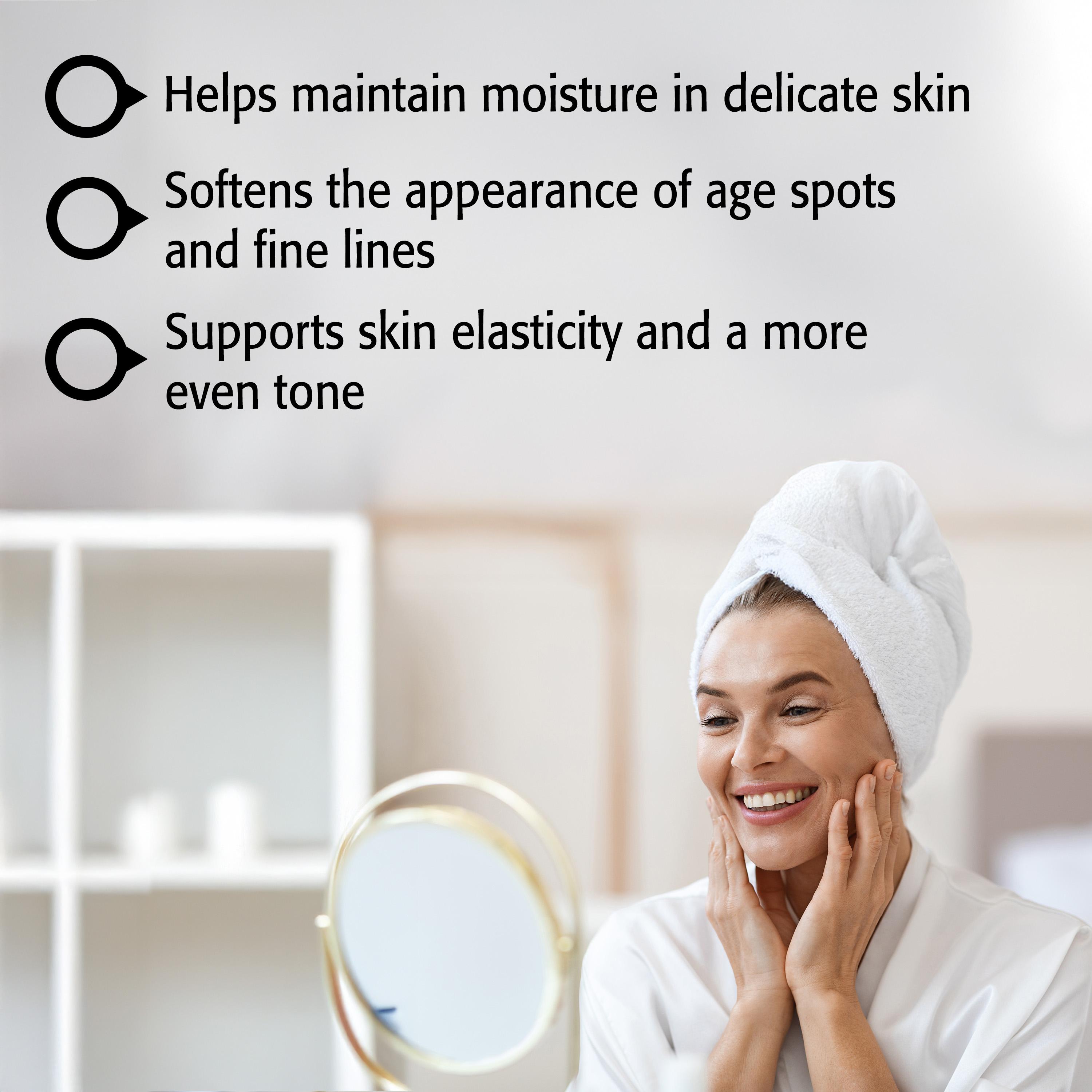 - Helps reduce the look of age spots and fine lines